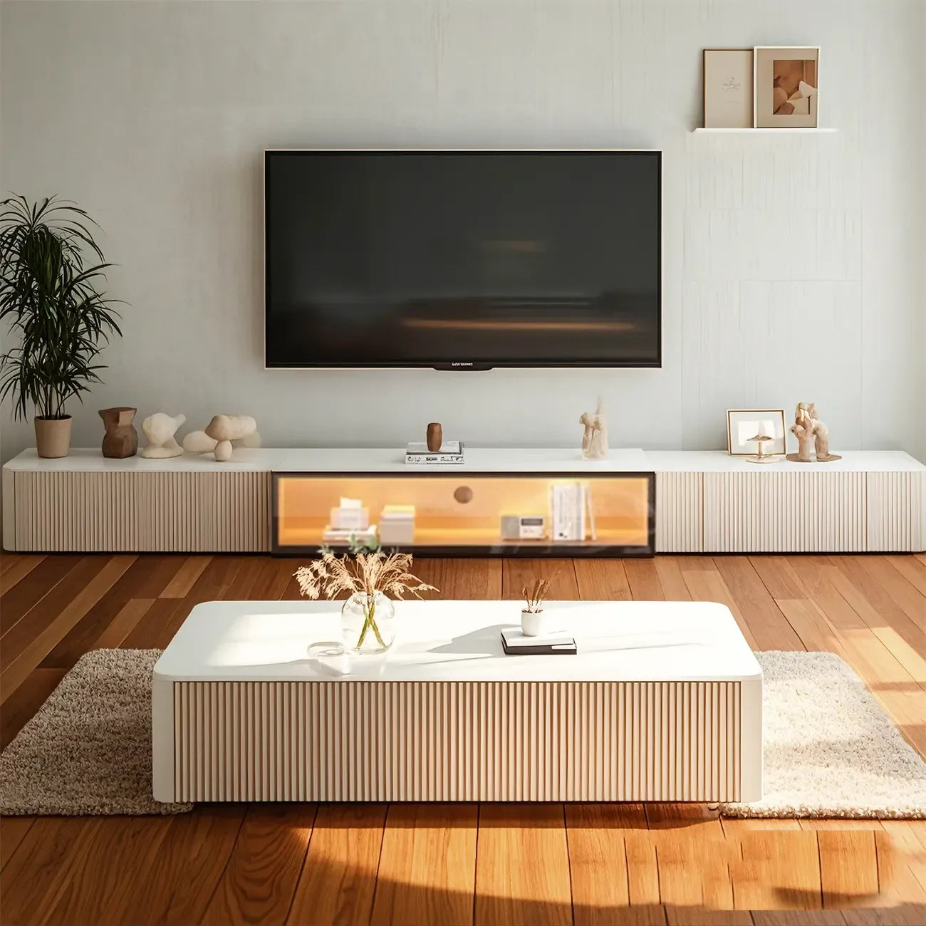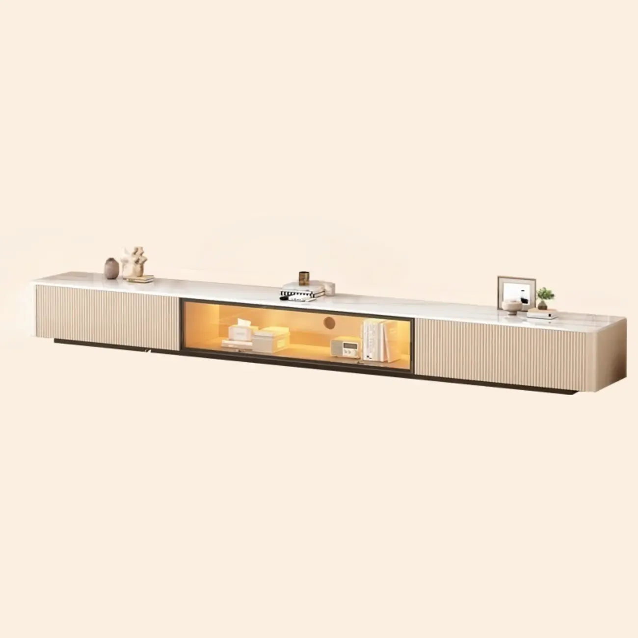 Meuble TV long en pierre couleur champagne 63 avec gestion des câbles