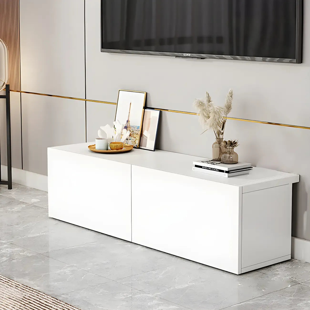 Meuble TV en bois blanc avec tiroirs et gestion des câbles (63 pouces)