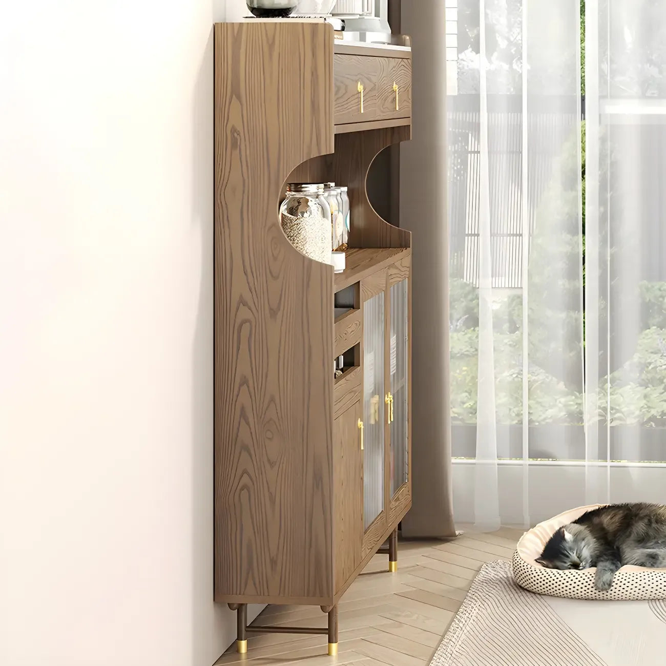 vaisselier de cuisine en bois brun avec porte vitrée et rangements