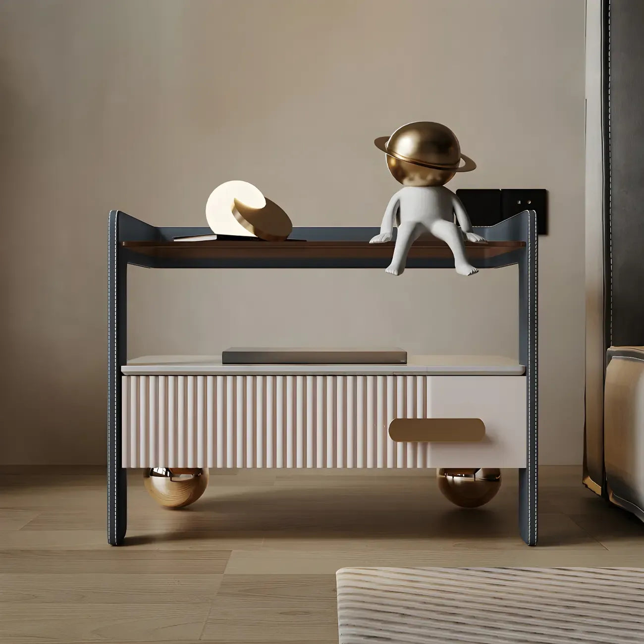 Table de chevet avec étagères et tiroirs ouverts en bois et éclairage LED
