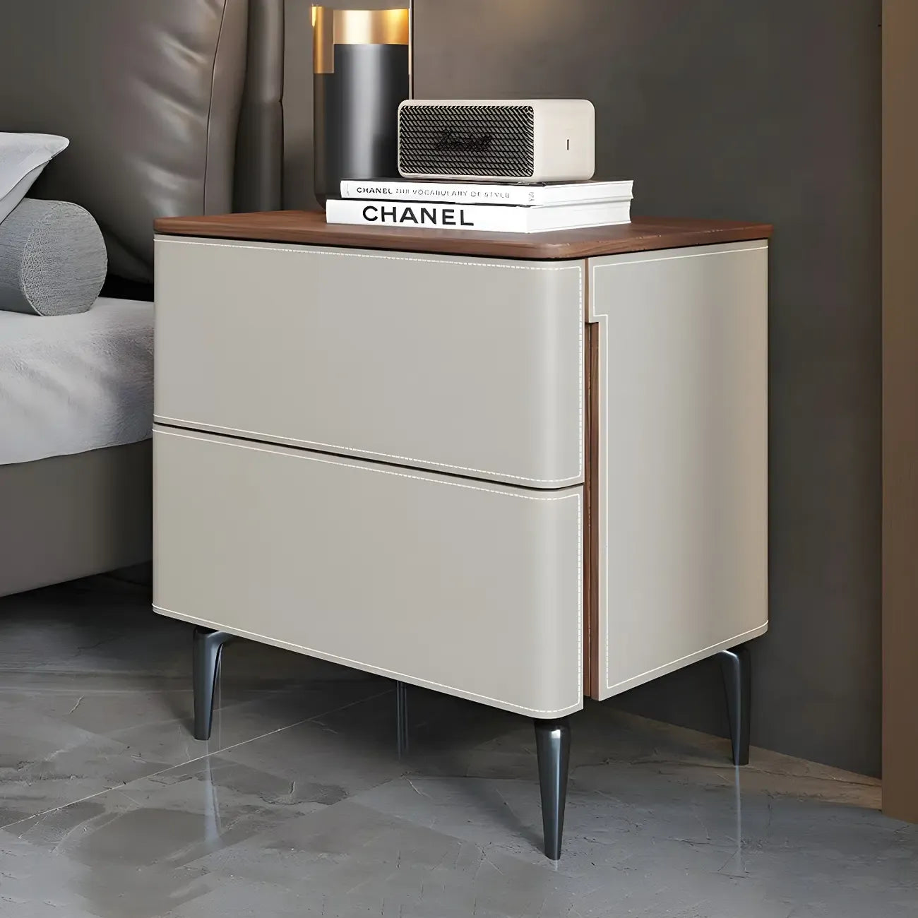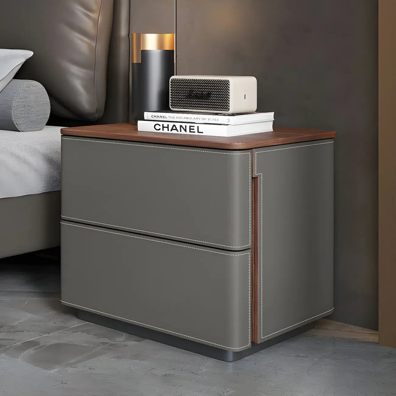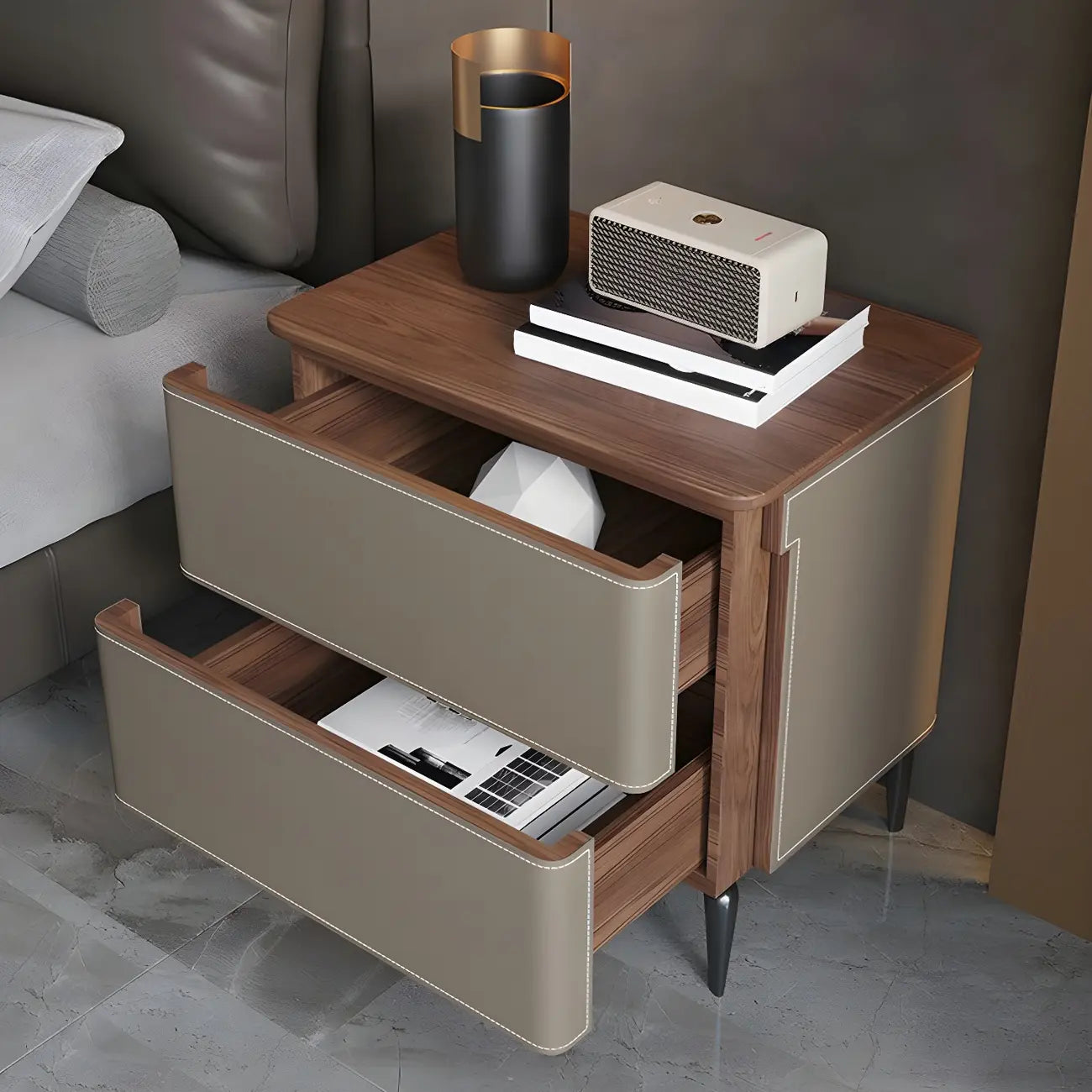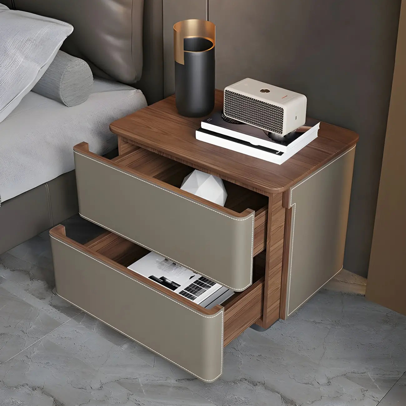 Table de chevet moderne avec tiroirs et plateau en bois et similicuir