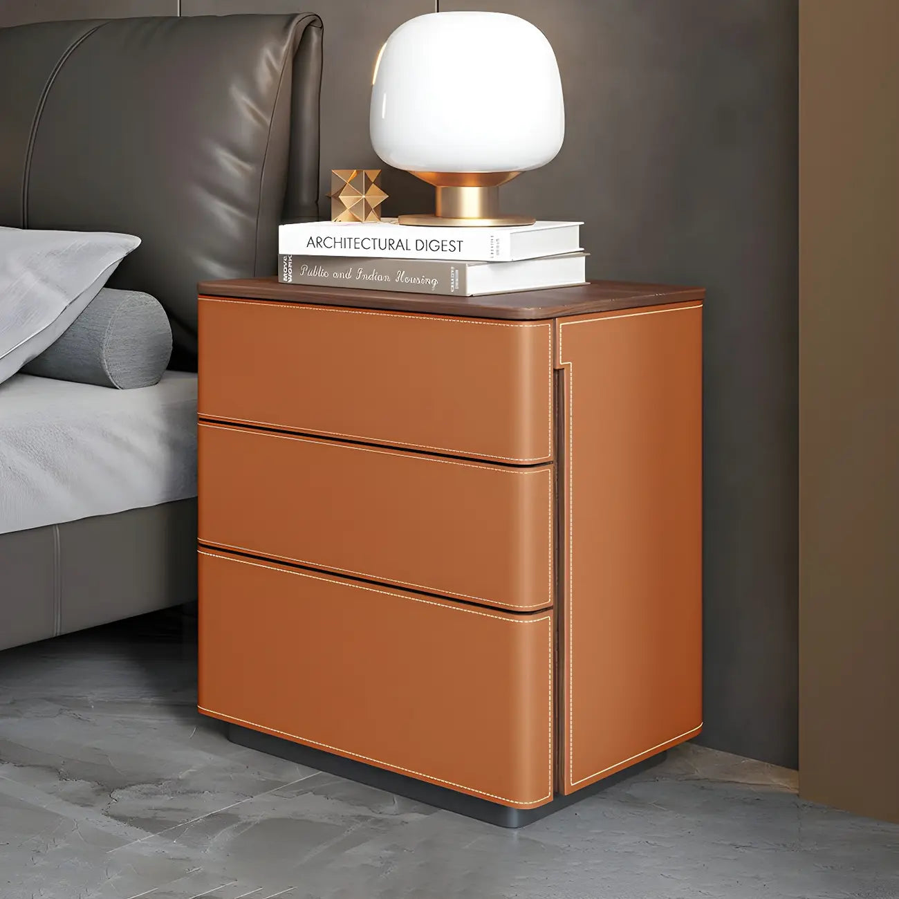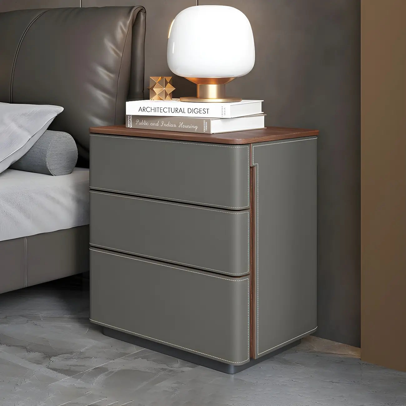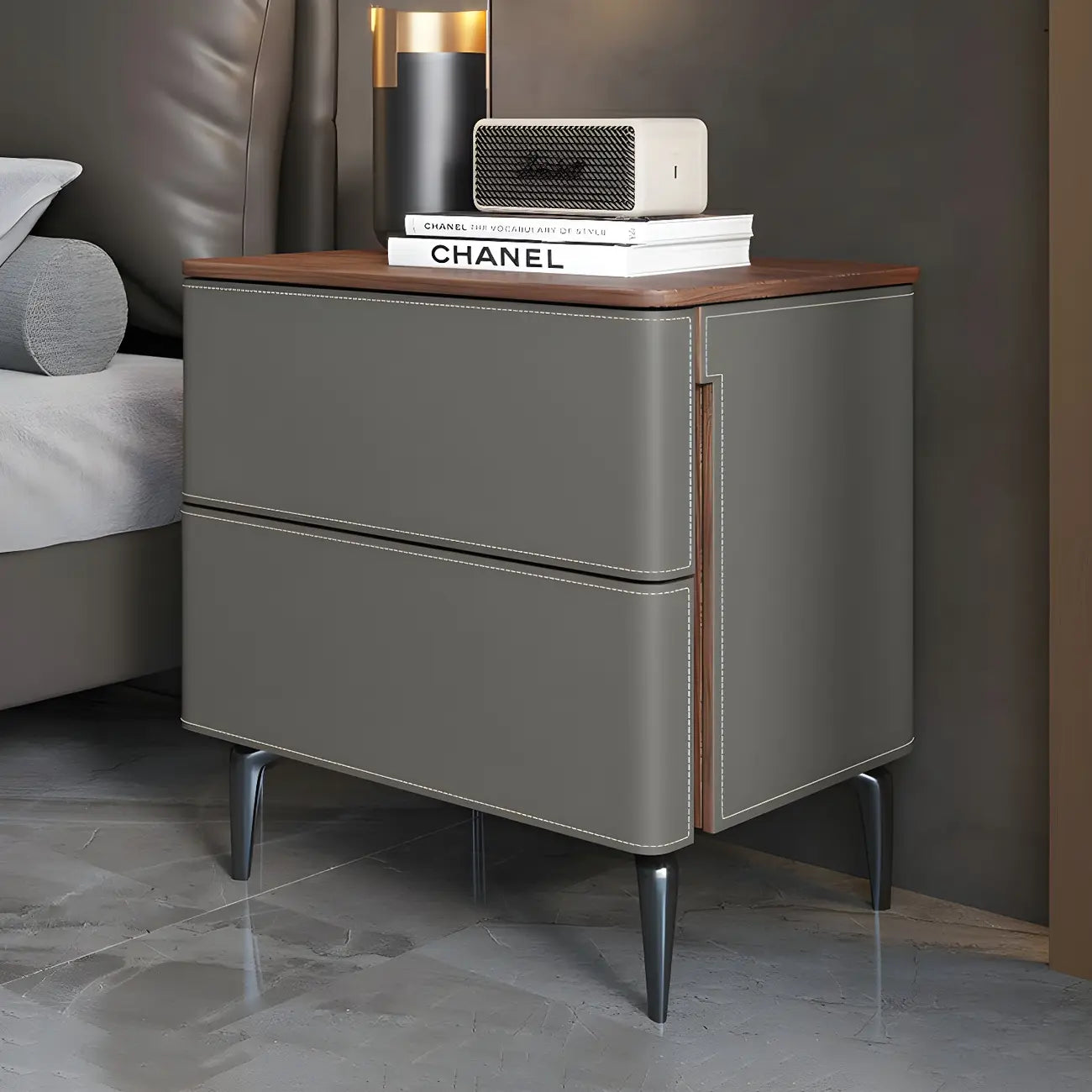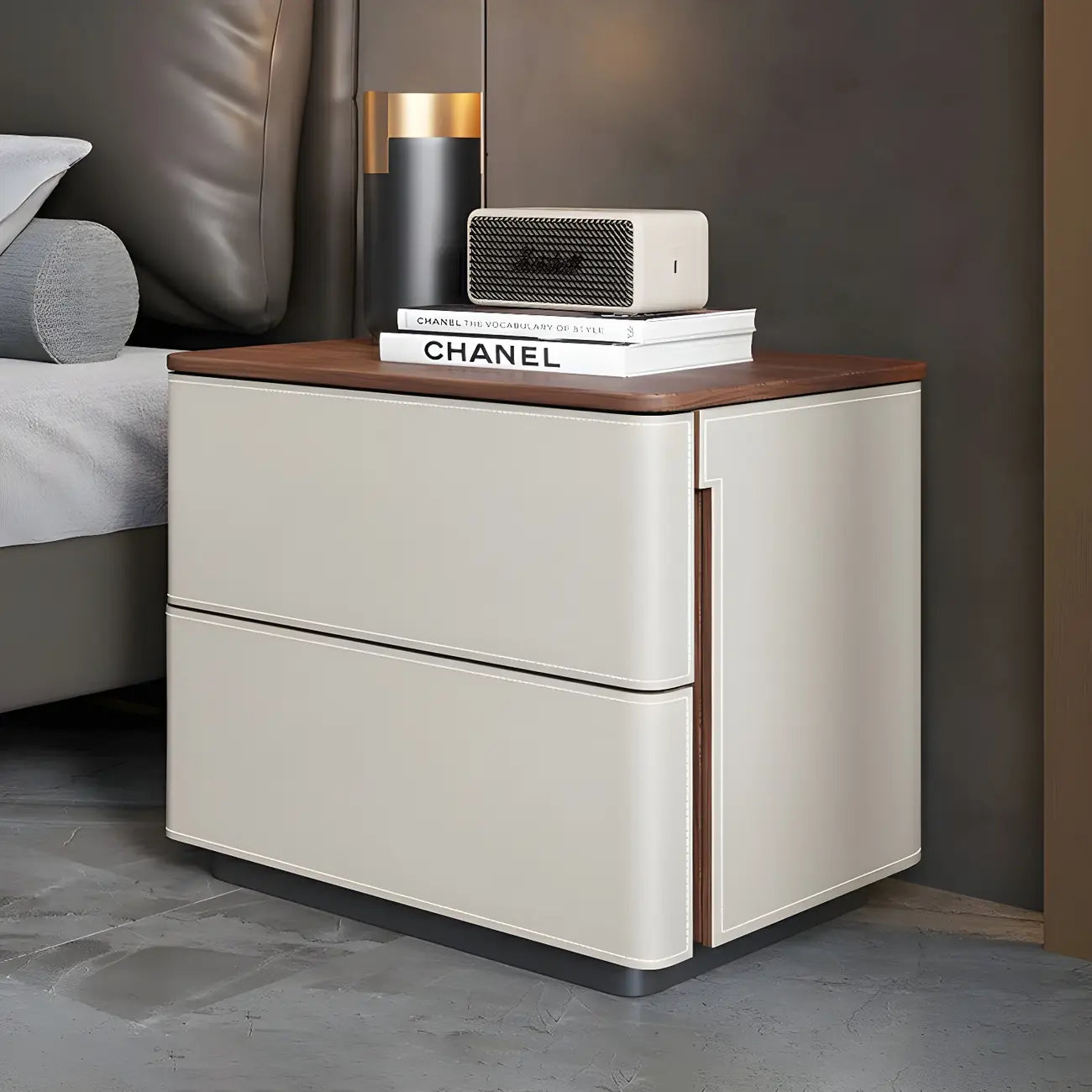 Table de chevet moderne avec tiroirs et plateau en bois et similicuir