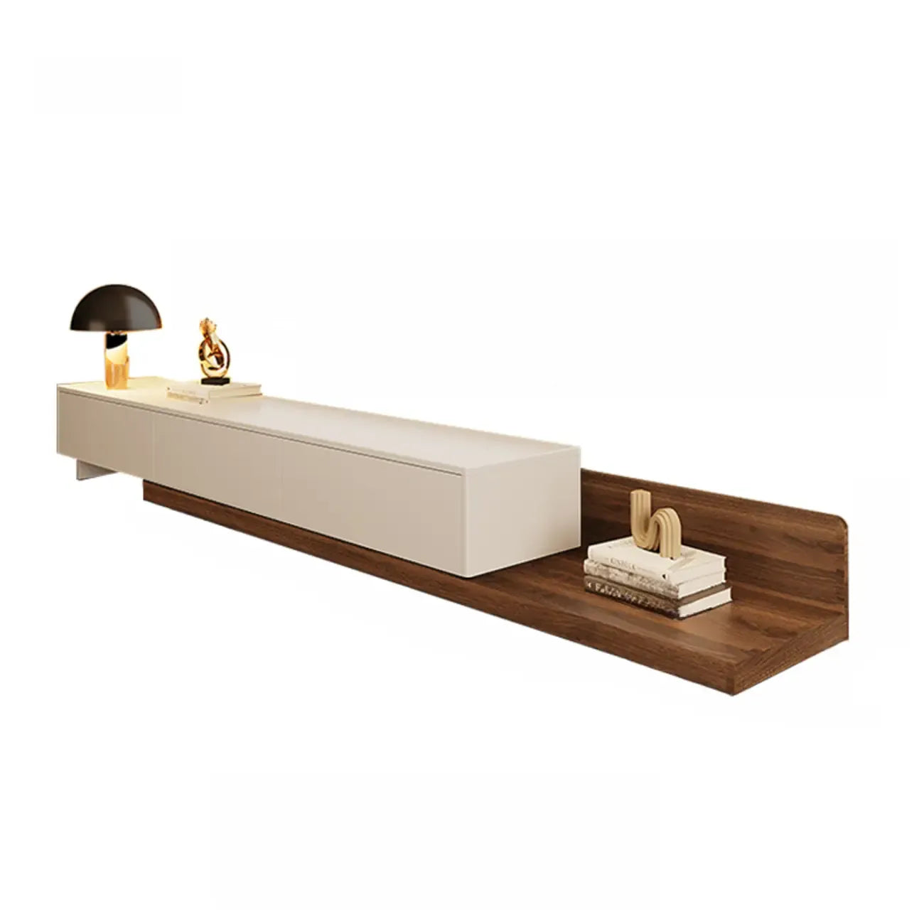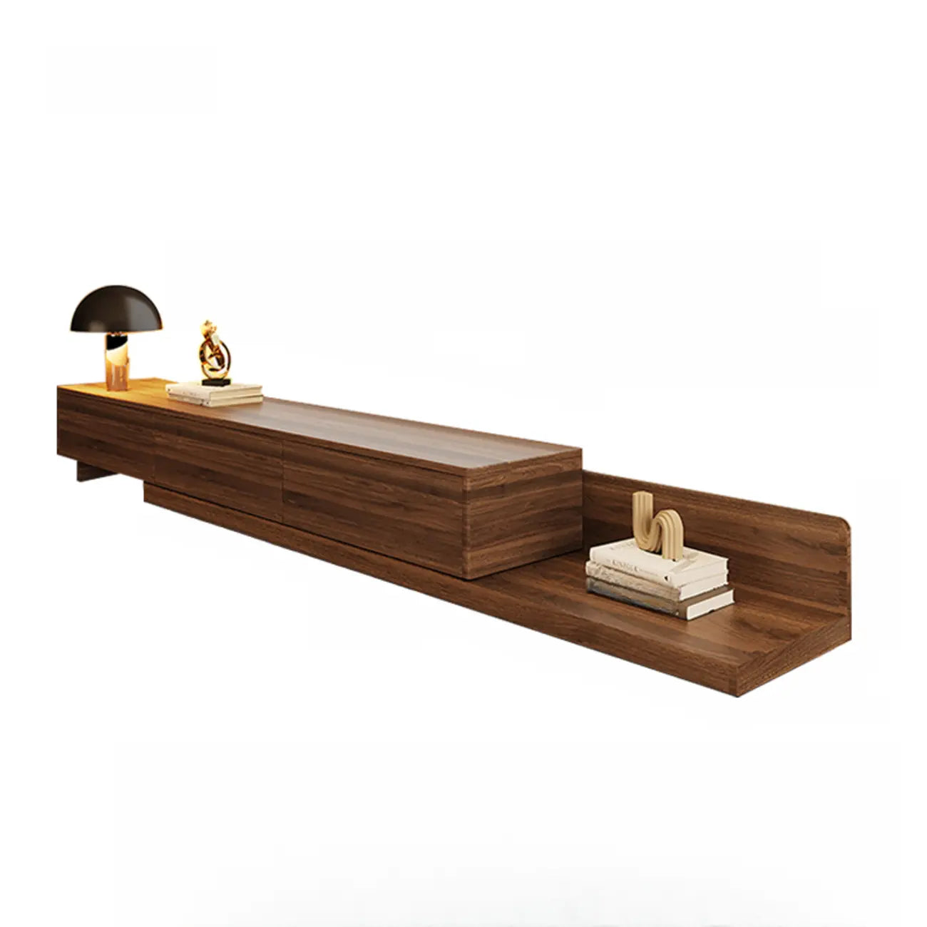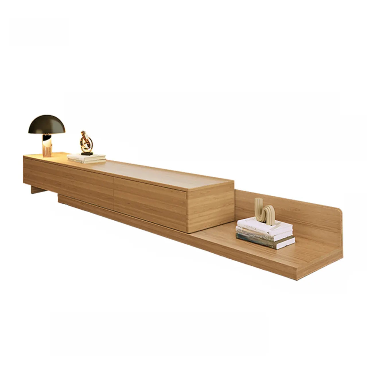 Meuble TV moderne en bois avec rangement ouvert et système de gestion des câbles