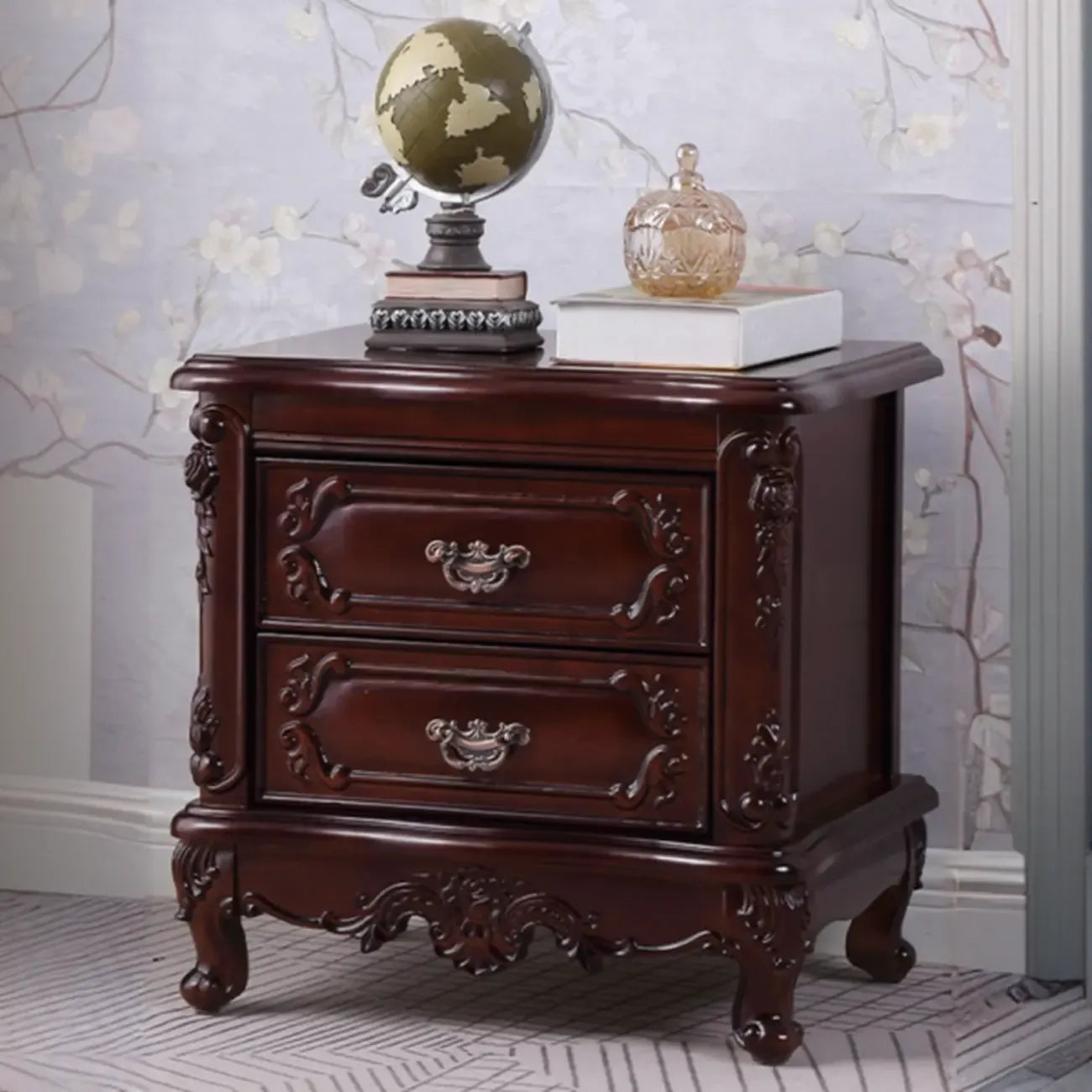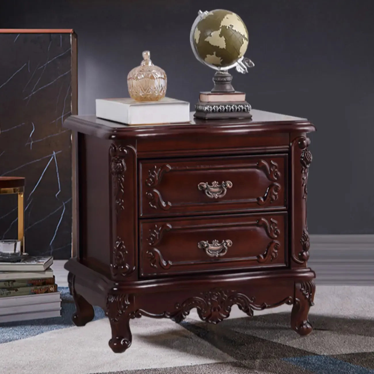 Table de chevet traditionnelle en bois sculpté à 2 tiroirs