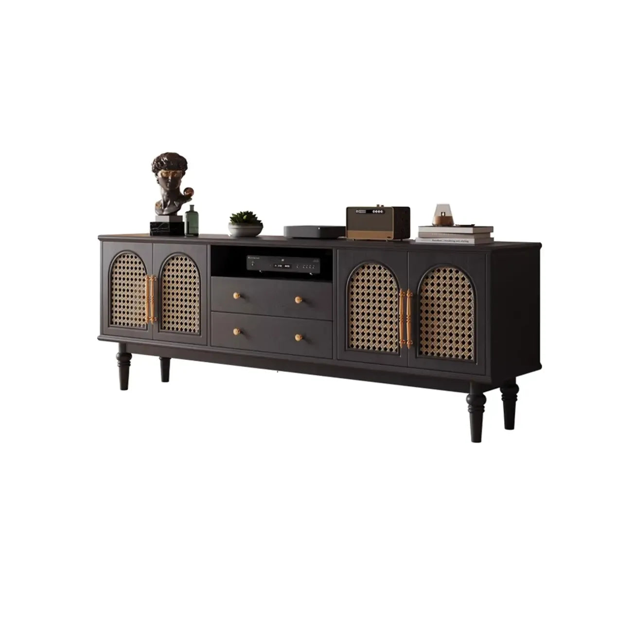 Meuble TV traditionnel long en bois noir avec portes en rotin