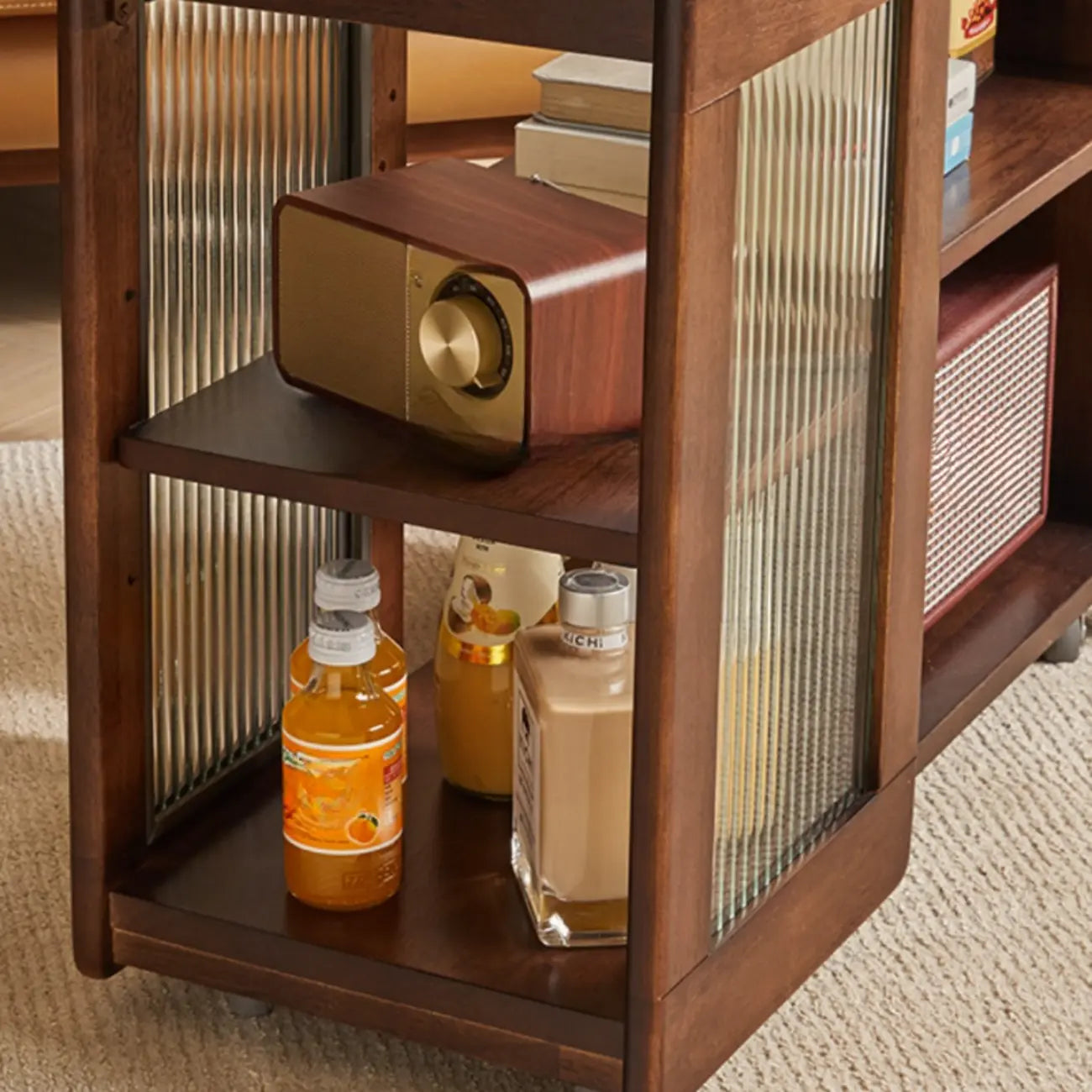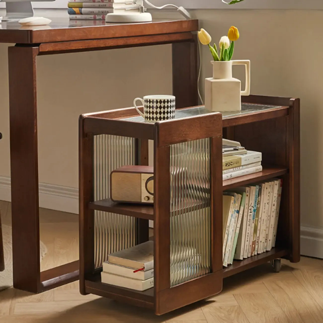 Table d'appoint pivotante rectangulaire vintage en bois avec plateau en verre